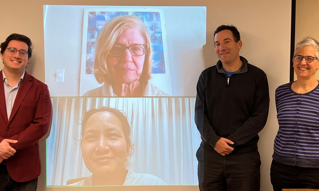 Pictured from left to right:  Francesco Burroni, committee member Dr. Draga Zec (top image, remote), committee member Dr. Chutamanee Onsuwan of Thammasat University, Bangkok ,Thailand (lower image, remote),  Committee Chair Dr. Sam Tilsen, and committee member Dr. Abby Cohn.