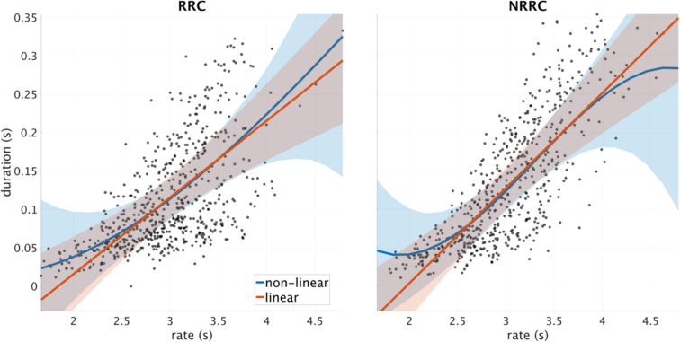 Specifically, we assess whether there is evidence for linear and/or non-linear relations with rate, and how those relations may differ between phrase boundaries.